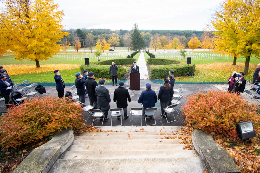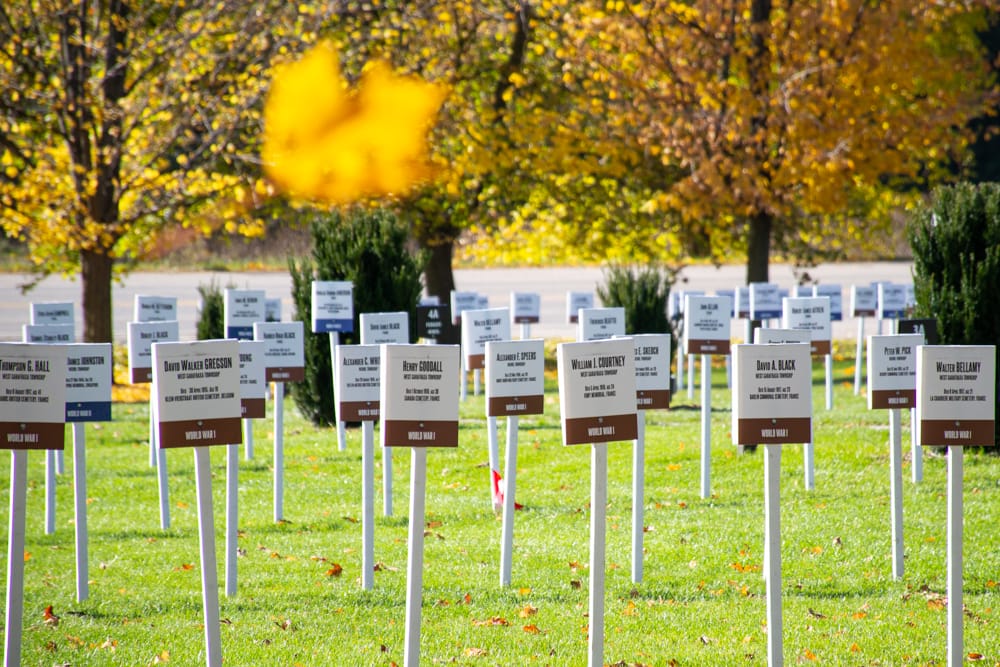 Leaves split from their branches by the November cold drifted onto beds of yellow in the background as the names of the dead were brought to life on the tongues of Legion members before gathered veterans, families, county staff, politicians and reporters.